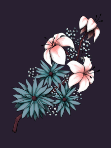 This particular piece was done specifically to be used on the front page of this site. Accordingly, the color palette was very limited, which created interesting challenges when shading the flowers. This was done using Adobe Fresco.