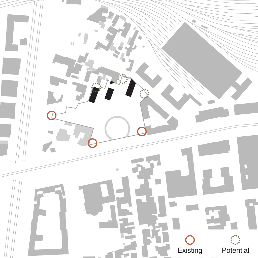 Above: Three diagrams created using the Nolli map analyzing urban relationships, site entrances, and site circulation